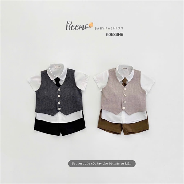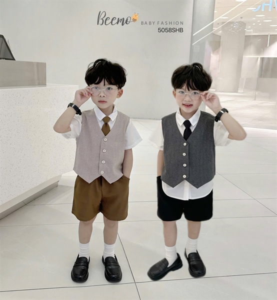 Thiết kế set gồm 4 chi tiết: áo gile vải chéo cao cấp, sơ mi cộc tay cổ đức chất liệu vải trượt, quần shorts thun siêu xinh, kèm theo phụ kiện cà vạt