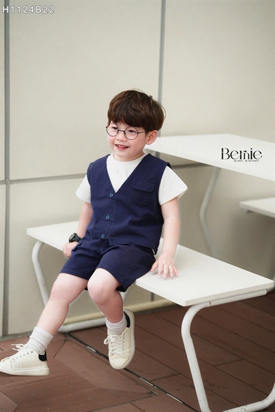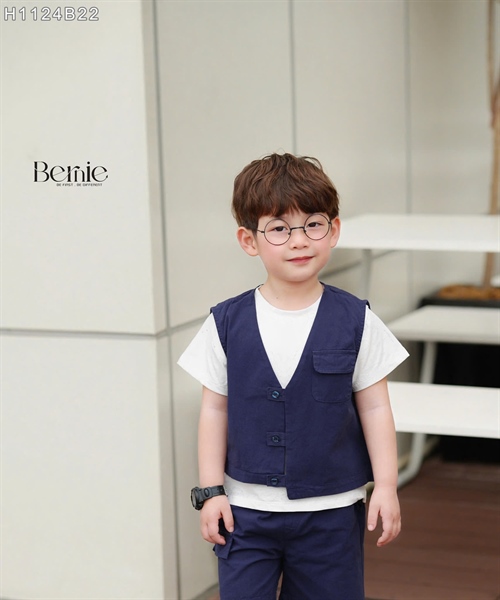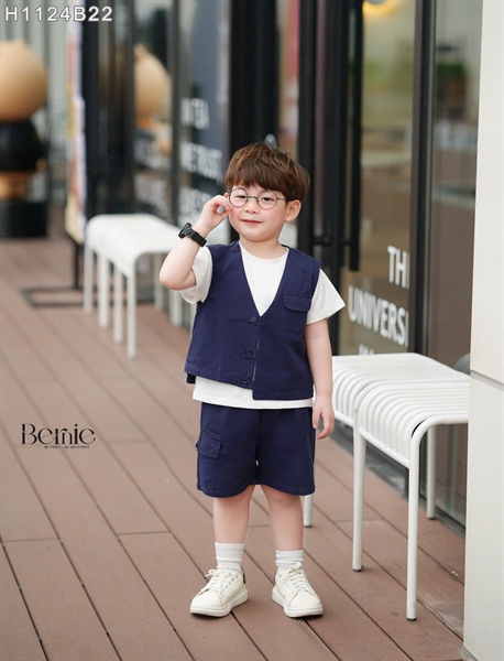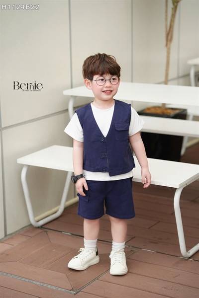 Thiết kế: set áo gile vạt lệch túi ngực cá tính, quần túi thật 2 bên, đính nắp túi khoẻ khoắn.