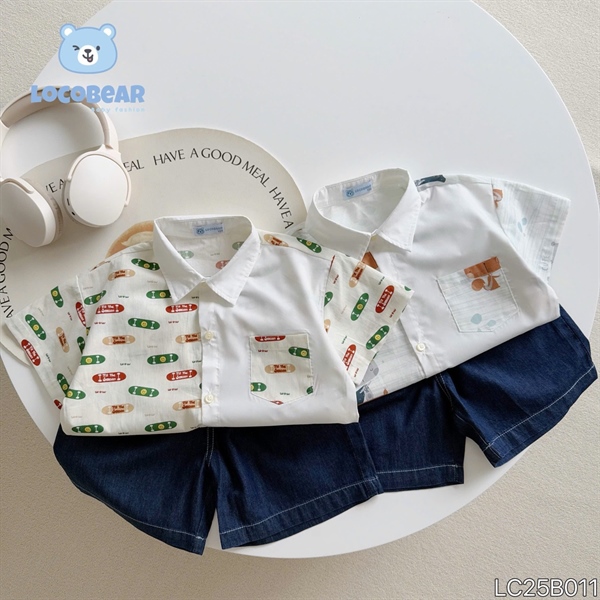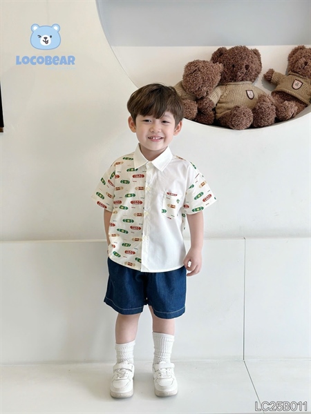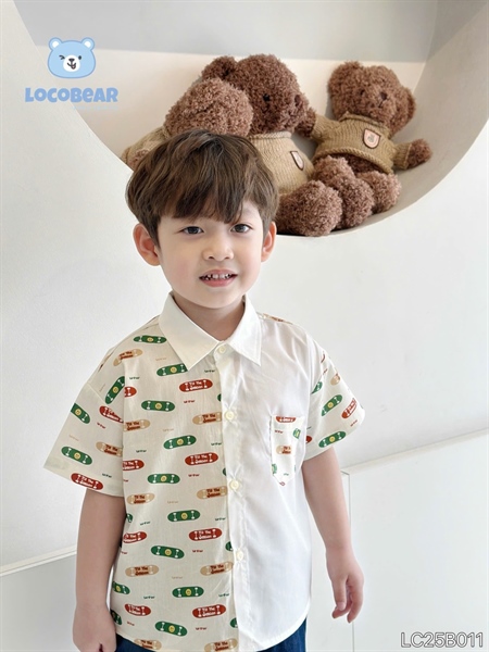Thiết kế áo sơ mi cổ đức phối thân độc đáo, điểm nhấn họa tiết nghộ nghĩnh, dễ thương, bé nào cũng thích mê