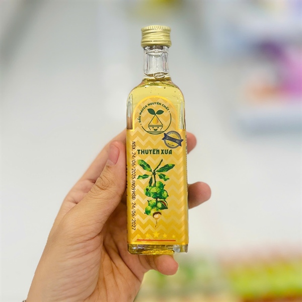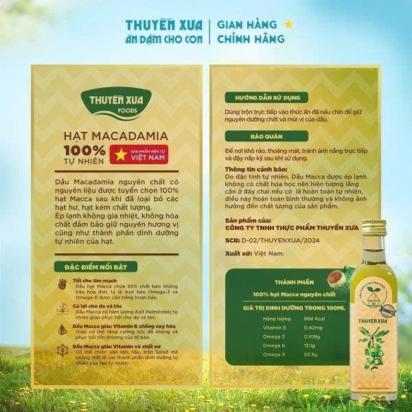 Thành phần thuần tự nhiên: Dầu ăn dặm Thuyền Xưa chiết xuất hoàn toàn từ hạt macca, không chất bảo quản, an toàn cho bé.