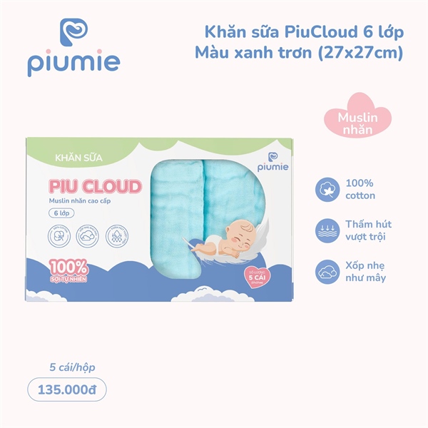 Khăn sữa muslin nhăn 6 lớp xanh trơn Piumie 27*27
