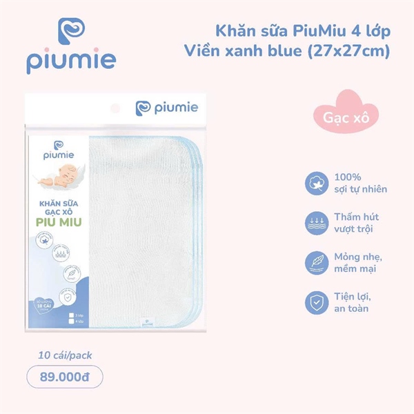 Khăn sữa gạc xô cotton 4 lớp viền xanh blue Piumie 27*27