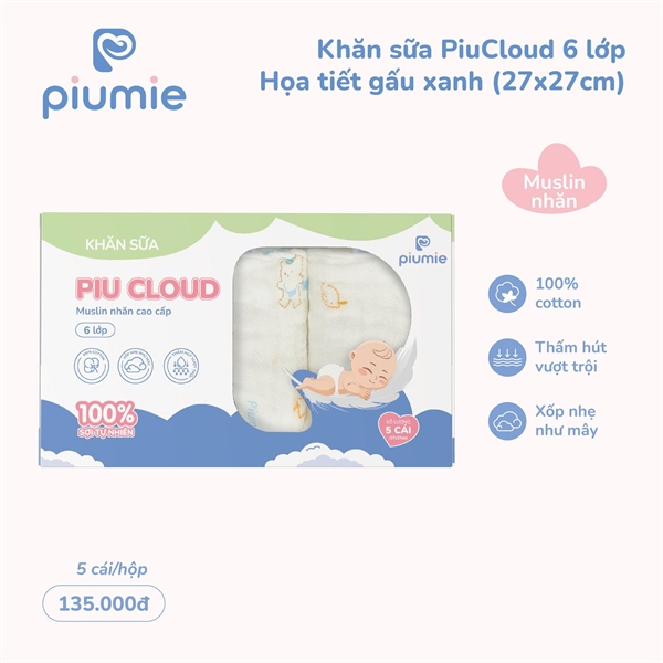 Khăn sữa muslin 6 lớp hoạ tiết gấu xanh Piumie 27*27