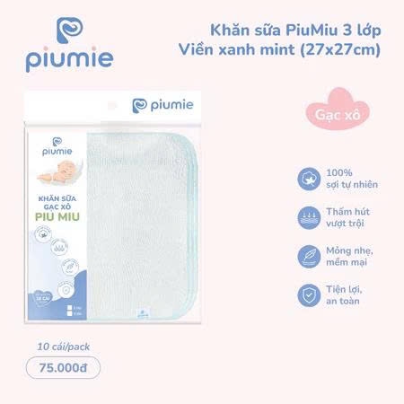 Khăn sữa gạc xô cotton 3 lớp viền xanh mint Piumie 27*27