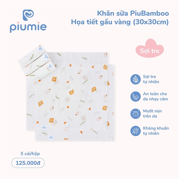 Khăn sữa sợi tre hoạ tiết gấu vàng Piumie 30*30