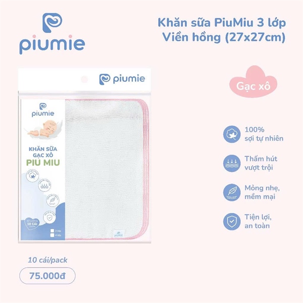 Khăn sữa gạc xô cotton 3 lớp viền hồng Piumie 27*27