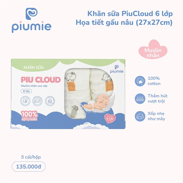 Khăn sữa muslin 6 lớp hoạ tiết gấu nâu Piumie 27*27