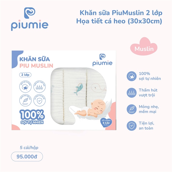 Khăn sữa muslin 2 lớp hoạ tiết cá heo Piumie 30*30