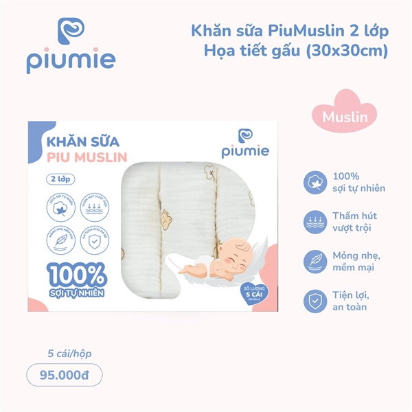 Khăn sữa muslin 2 lớp hoạ tiết gấu Piumie 30*30