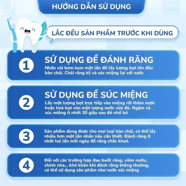 Sản phẩm dùng được cho mọi loại bàn chải, có thể lấy nhiều hơn một lần nhấn nếu cần thiết. Đánh răng ít nhất hai lần mỗi ngày để răng chắc khoẻ.