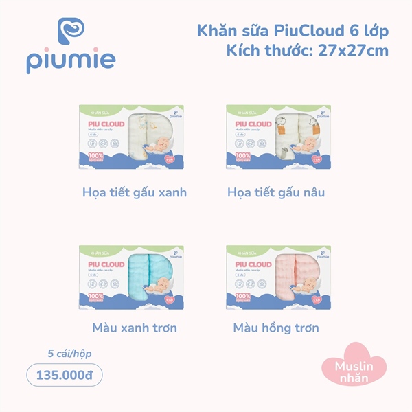 Khăn sữa muslin nhăn 6 lớp xanh trơn Piumie 27*27 - Hộp